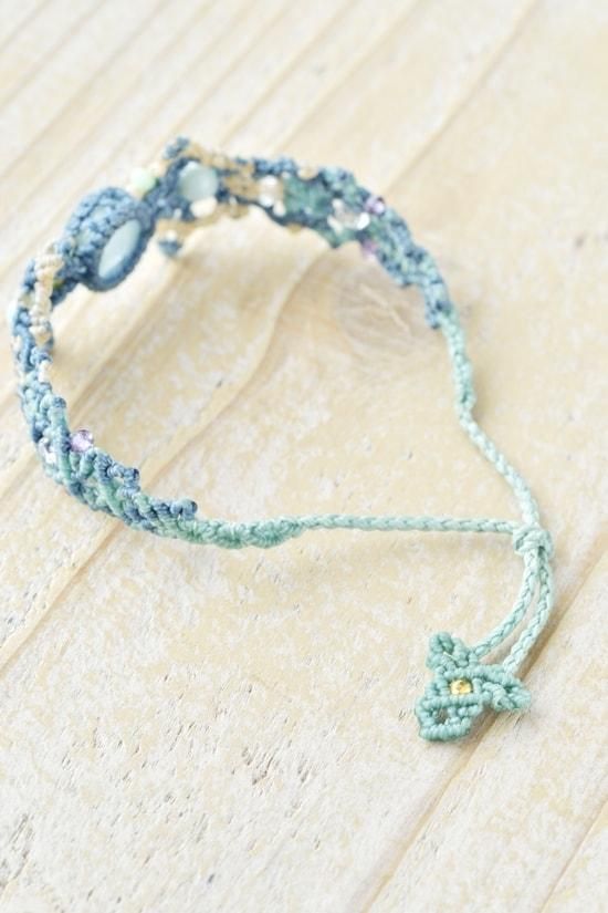 優し気なブルーのアクアマリンをメインにサイドには18KGPビーズ、クリソプレーズ、ラリマー、水晶、アメジストを編み込んでいます。