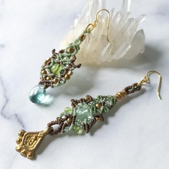 もう片方にはオリエンタルな雰囲気がステキなブラスパーツをメインにペリドット、フローライトを編み込み、淡いグリーンを基調としたミックスカラーで爽やかに仕上げました。