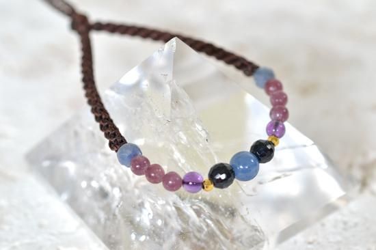 使用ビーズはカイヤナイト、カットされたブルーのサファイヤ2種、Silver925のK18仕上げビーズ、アメジスト、レピドライト。